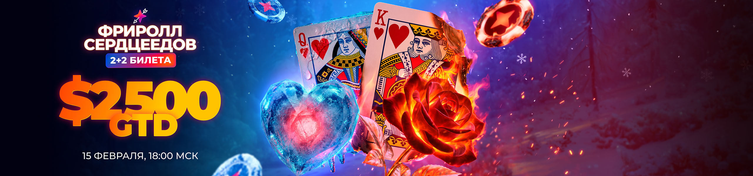 15 февраля в 18:00 МСК — Фриролл сердцеедов с гарантией $2 500. Это не просто турнир, здесь вы можете играть сразу несколькими стеками! Да-да, вы не ослышались! Разные стеки за разными столами и шанс на выигрыш в 4 раза выше!
