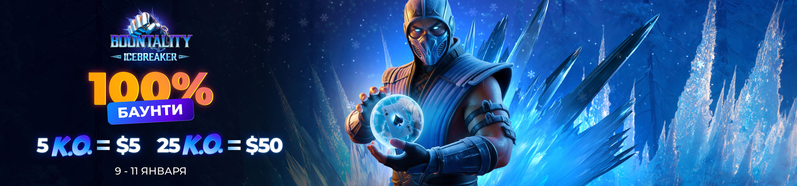 9-11 января — холодные выходные в стиле персонажа Mortal Kombat Sub-Zero! Три дня турниров в формате 100% Bounty с бай-инами от $5.5 до $25, где PokerPlanets доплачивает за точные “удары” по оппонентам. Каждые 5 нокаутов — дополнительные $5 от PokerPlanets.